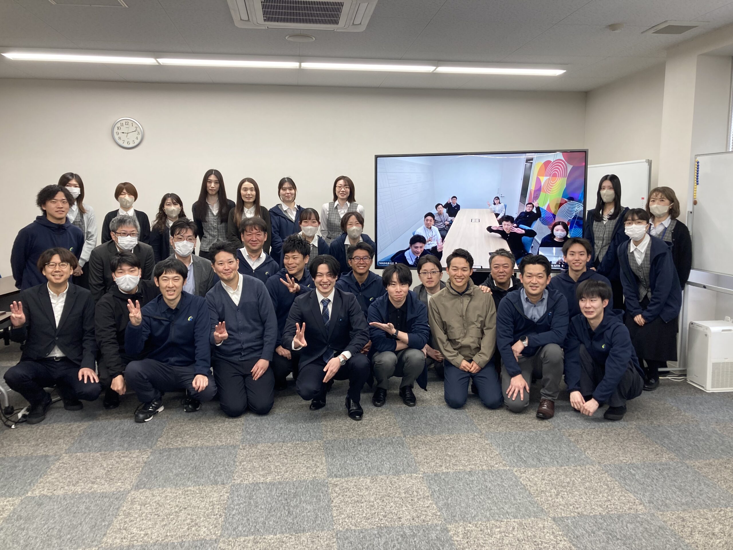 最後には歓迎の気持ちを込めて、社員で集合写真を撮影いたしました。(東日本事業部はWEBで参加…!)
